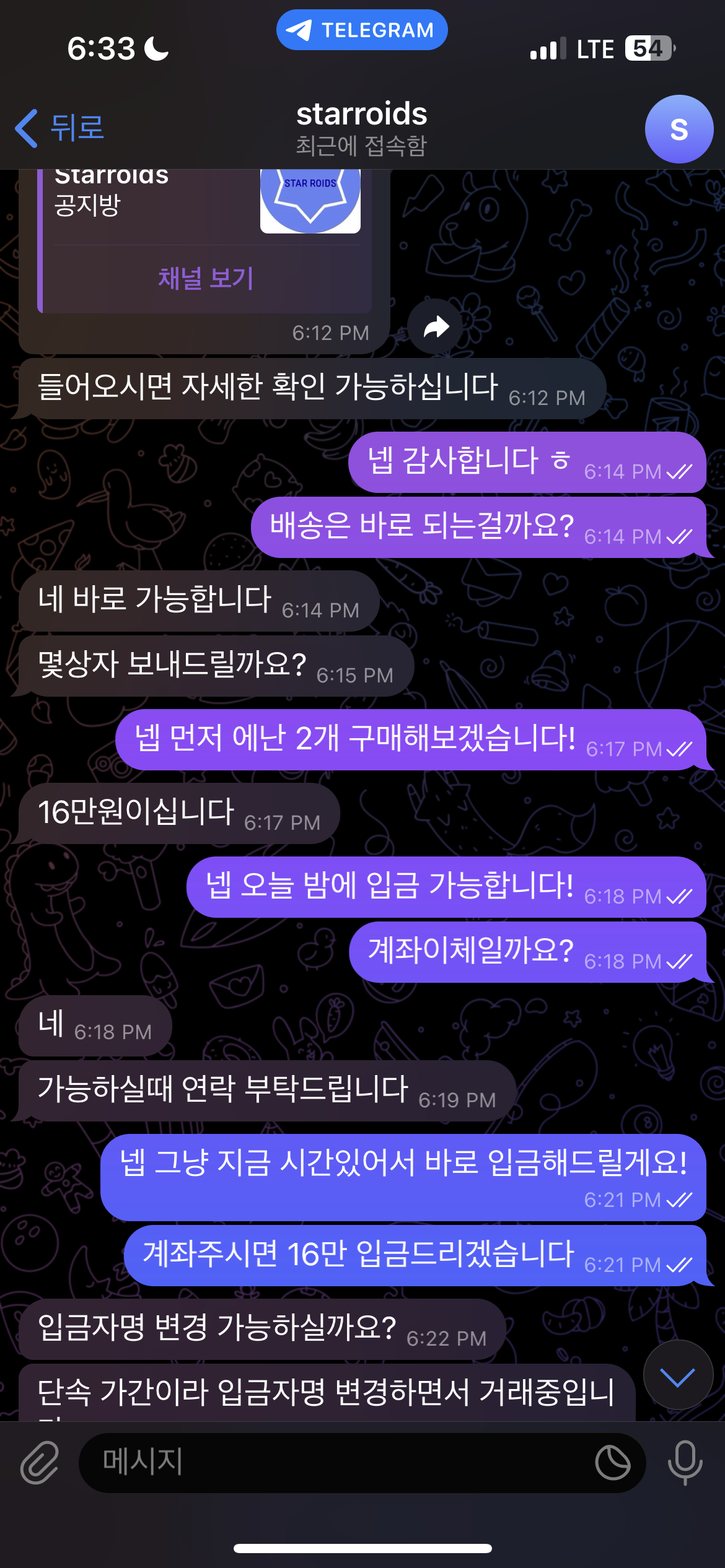텔 보냈더니 갑자기 아이디 starroids로 바꾸고 자기 그룹방 초대하고 입금 유도합니다.